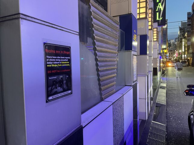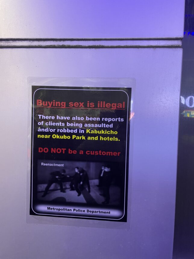 「売春の相手方となる行為は、法律で禁止されています。歌舞伎町大久保公園周辺・ホテル街で、売春の相手方に対し、暴行や現金を強奪する等の事案が発生しています」